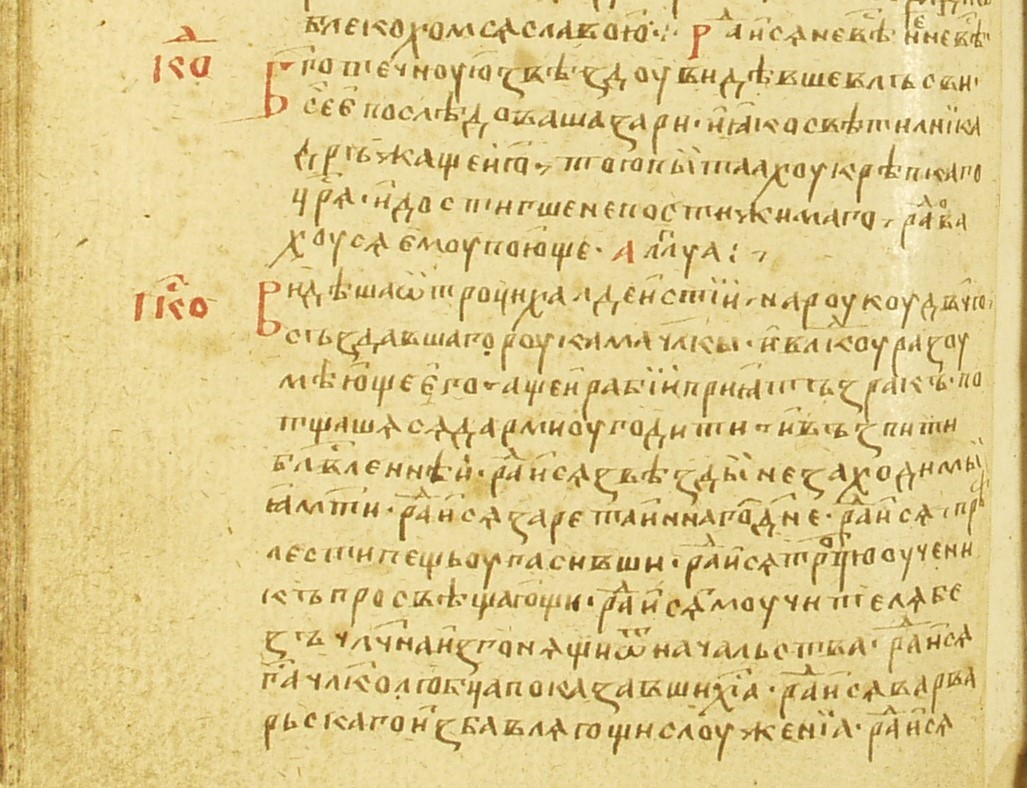 — во-первых, наличие «Афонской» редакции акафиста в рукописях, связанных с учениками прп. Сергия ( Др.гр. 15, ТСЛ 16, ТСЛ 253 ), тогда как в подавляющем большинстве сборников келейного правила на Руси и в русских списках Постной триоди с нач. XV в. преобладает «Русская» редакция, что следует связать с иной традицией, идущей от митр. Киевского Киприана (1375–1406) и имевшей общецерковный характер;