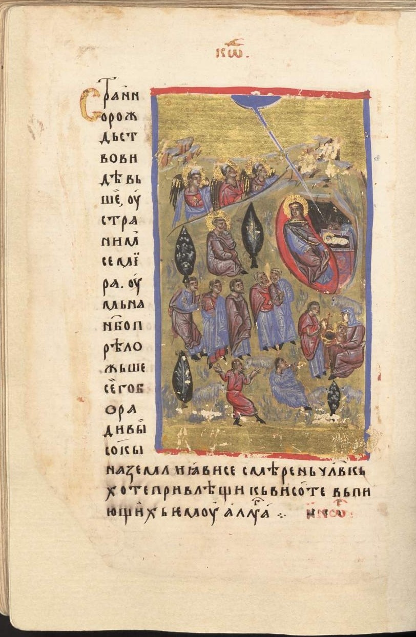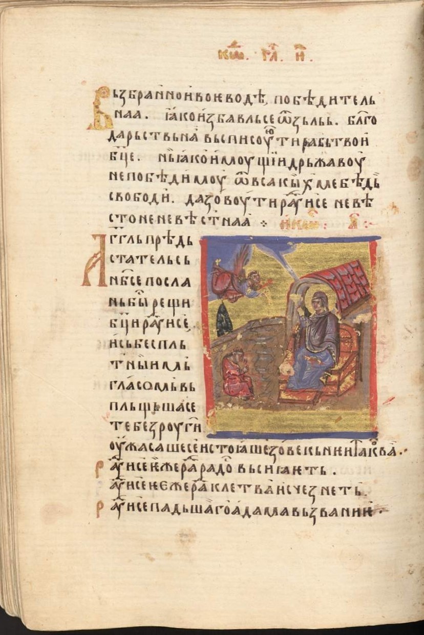 Наиболее раннее свидетельство находим в афонском предании о зографских мучениках, которое сохраняет память о событиях, связанных с латинским вторжением на Афон после заключени я имп. Михаилом VIII Палеологом Лионской унии с латинянами в 1274 г. Согласно пространной патериковой повести[27], некий старец-отшельник, келья которого была недалеко от святой обители Зограф, имел правило ежедневно читать акафист перед келейной иконой Богоматери. Совершая пение в очередной раз, он получил от Пресвятой Богородицы откровение о приближении латинян и о предстоящем подвиге исповедания православной веры для монахов Зографа. Укрепленные принесенным через отшельника известием свыше иноки, отклонив униатские претензии пришельцев, были сожжены в башне, совершая свой подвиг с пением псалмов и акафиста Богородице. На пепелище была найдена в сохранности икона, перед которой получено откровение и которая почитается в Зографе с того времени под именем «Акафистная»[28]. Очевидно, что в последней четверти XIII в. для акафистного пения могла использоваться лишь триодная редакция гимна. Весьма вероятно, что отражение этой древней традиции представляет собой сербский список акафиста в древней «Триодной» редакции со следами влияния новой «Афонской» редакции[29], который находится в Псалтири с дополнительными статьями из библиотеки Хиландарского монастыря на Афоне № 453 — это пергаменный кодекс, судя по всему, местного происхождения, писанный во второй четверти XIV в.[30]