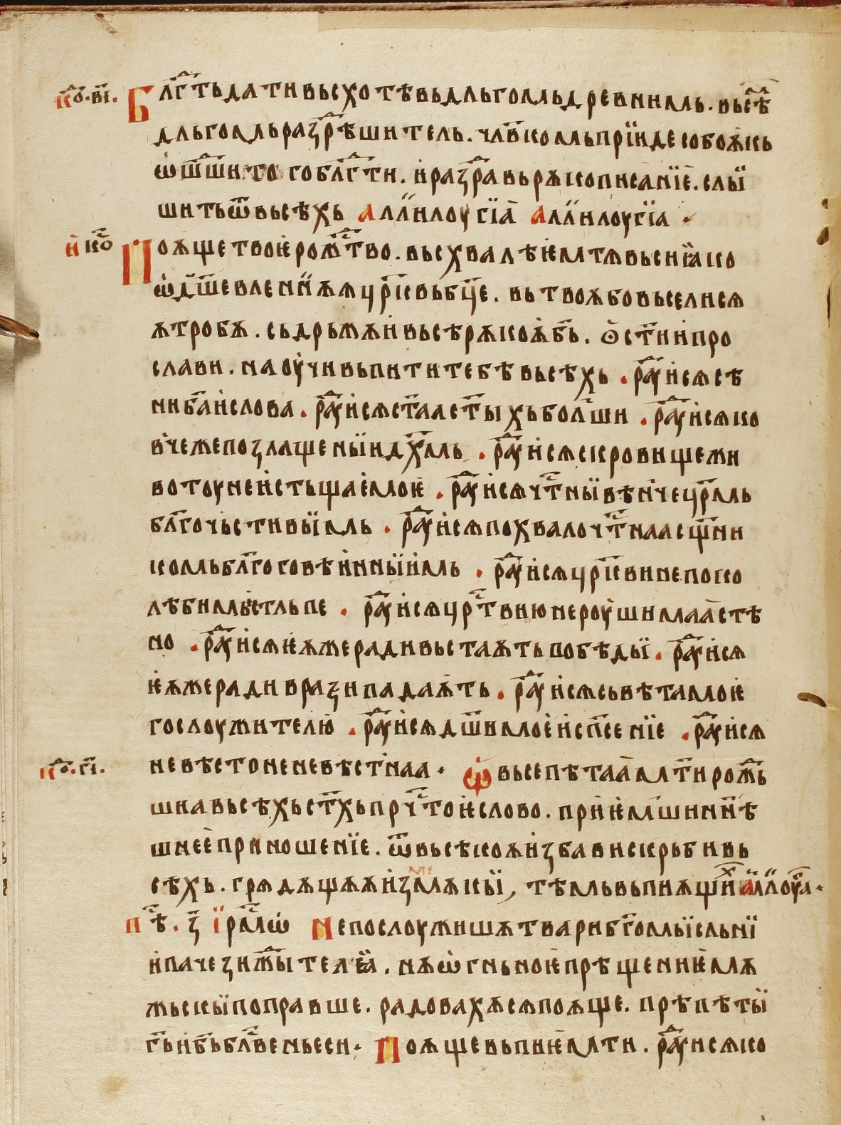 Помимо перечисленных источников назовем также русскую пергаменную Псалтирь с дополнительными статьями келейного правила, которая хранится в Ватиканской библиотеке: Vat. slav. 8 (Кон. XIV — нач. XV в.). К Псалтири добавлены: последование ко святому причащению и служба Акафиста[37]. Источником для последней указан некий «Устав Святыя горы», согласно которому служба совершается соборно в монастырском храме с понедельника на вторник. Происхождение самой рукописи, скорее всего, относится к московскому Чудову монастырю, тогда как перемещение ее в Рим связано с бегством из Москвы митр. Исидора (1441)[38], поддержавшего Флорентийскую унию. По некоторым признакам, к келейной традиции прп. Сергия этот уникальный список не имеет прямого отношения: здесь, во-первых, текст находим в древней «Триодной» редакции, во-вторых, структура службы Акафиста соответствует исправленной Триоди[39], где кондаки и икосы разделены на четыре отдела (статии). В отличие от этой структуры все прочие списки службы Акафиста, предназначенные для келейной молитвы, помещают кондаки с икосами по 6-й песни обрамляющего их канона (согласно последованию древней славянской Триоди, бытовавшей на Руси и у южных славян до афонской справы), что и стало традицией для молебнов, имеющих в составе гимны акафистного жанра.