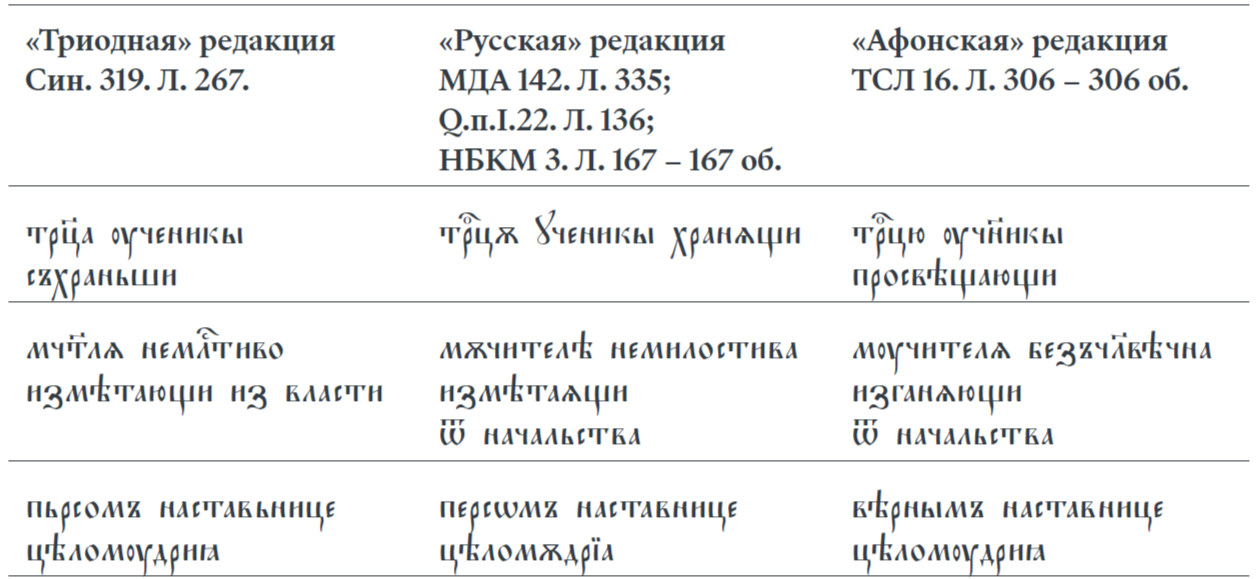 Исследователям известно, что в XIV — нач але XV в. русская книжность знает три редакции Великого акафиста[15]: древнейшая из них — «Триодная», списки которой находим в Триоди Постной (вплоть до смены церковного устава, когда пришла новая редакция богослужебных книг при свт. Киприане, митр. Киевском и всея Руси), а также две новых — «Афонская» и «Русская»[16]. Обе новых редакции появились в отечественной книжности не ранее последней четверти XIV в. Сведения о происхождении редакций собраны в исследованиях Т. С. Борисовой[17]. «Афонская» редакция хорошо известна в южнославянских списках XIV в., а возникновение ее связано со славянской книжной справой начала XIV в. на Афоне[18], отсюда и название данной редакции. Иную редакцию Т. С. Борисова назвала «Русская», поскольку, по ее мнению, редакция имела распространение «только в восточнославянских регионах» и «вероятно, была создана исключительно для восточных славян книжниками из окружения митр. Киприана»[19]. Впрочем, происхождение «Русской» редакции требует дальнейшего выяснения, поскольку можно указать близкие к ней списки акафиста болгарского происхождения: Q.п.I.22 (перв. четв. XIV в.), НБКМ 3 (кон. XIV в.). Редакция в них весьма близка к «Русской» и, в то же время, отличается от древней «Триодной», а также от новой «Афонской» (см. таблицу ниже)[20]. Можно думать, что «Русская» редакция занимает промежуточное положение: берет происхождение он начальной стадии афонской книжной справы, где за основу был взят текст «Триодной» редакции, а итогом последующего этапа этой справы стало появление «Афонской» редакции.