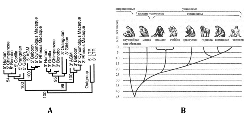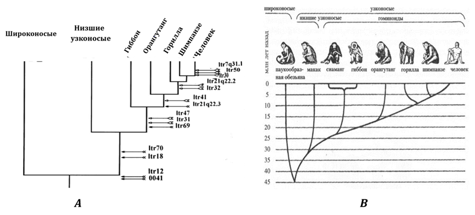 Масштабное исследование, основанное на анализе девятнадцати разновидностей длинных концевых повторов (LTR) у приматов и человека, было проведено Ю. Б. Лебедевым с сотрудниками[28]. По принципу наличия и отсутствия разновидностей LTR было реконструировано эволюционное древо (Рис. 6А). Оно идентично древу, построенному на основе костных останков (Рис. 6В). Также была оценена скорости мутирования LTR-последовательностей и, исходя из данных об их изменчивости, рассчитано время внедрения каждой из разновидностей ретровирусов в геном приматов. Для 19 групп LTR возраст появления исходного варианта ретровирусной вставки составил от 3,5 до 53 млн лет. В большинстве случаев также было отмечено совпадение времени внедрения исходных ретровирусов с представлениями о филогении приматов, полученными на основе анализа LTR-последовательностей.