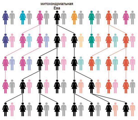 Митохондрии есть в каждой клетке. У каждой из них есть собственная ДНК (не та, что в ядре клетки) — мтДНК. Ребенок наследует только митохондрии матери, которые находятся в яйцеклетке. Следовательно, у каждого ребенка мтДНК — только от матери. Через отцов мтДНК не передаются. Для того, чтобы женщина передала свою митохондриальную ДНК другим поколениям, ей нужно родить дочь, а той родить ещё дочь, и так далее. Общий предок, определенный по мтДНК, — «митохондриальная Ева». Схема демонстрирует (Рис. 10), каким образом в результате генетического дрейфа разнообразие мтДНК в популяции в конце концов приходит к одному-единственному варианту, носителем которого становятся все женщины. Рождение детей разного пола и в разном количестве при передаче потомкам только через дочерей неизбежно приводит к тому, что только один вариант мтДНК остается в популяции. При этом вычисленная «митохондриальная Ева» не является единственной женщиной и не является первой в цепи предков.