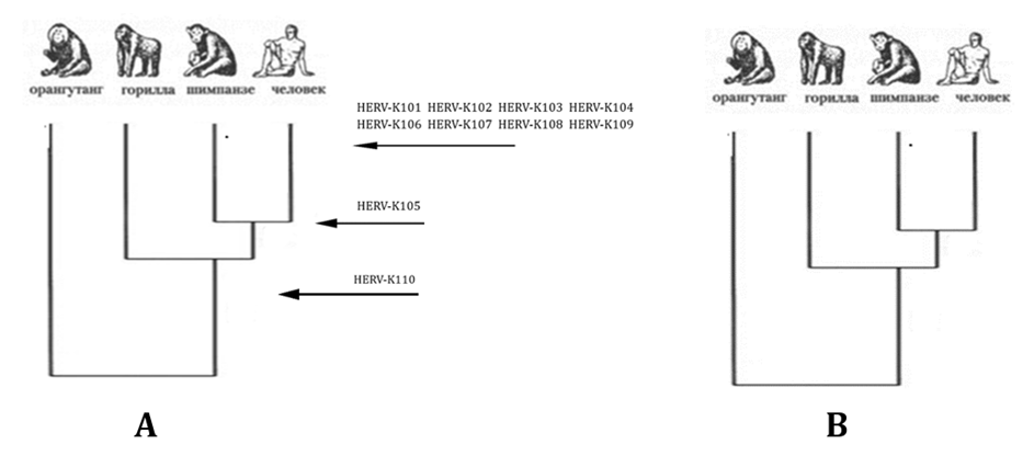 Эволюционные древа приматов и человека, построенные по данным Barbulescuetal., 1999 о наличии эндогенных ретровирусов HERB-K (A) и на основании анализа костных остатков[27]