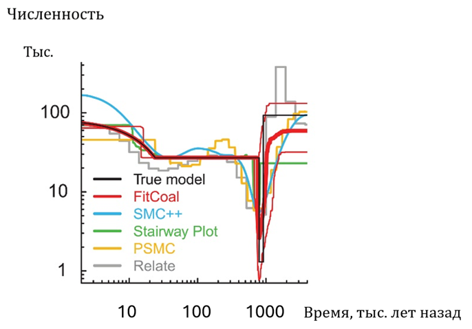 В последние годы разработаны и усовершенствованы математические методы, позволяющие оценивать численность человеческих популяций в древности на основе анализа генома. В частности, был разработан метод, при применении которого результаты расчетов не зависят от демографической модели, по которой изменялась численность популяции. Такой математический анализ, сделанный на основании частот аллелей в десяти современных африканских популяциях человека, показал[45], что в самые критические периоды падения численности (800–900 тыс. лет назад) количество наших предков по телу составляло около 1280 особей, причем нижний предел численности популяции в этот период — 730 особей (Рис. 12). Численность Homo до и после прохождения этого «горлышка бутылки» была, по расчетам, выше примерно в 75 раз. Как отмечают авторы, вычисленный ими временной интервал «горлышка бутылки» соответствует периоду малой численности имеющихся ископаемых остатков гоминин в Африке и Евразии 950–650 тыс. лет назад. При этом относительно высокая численность Homo, по данным расчетов, имела место по крайней мере 0,9–1,4 млн лет назад, когда существовал только заметно отличающиеся от Homosapiens вид — Нomoerectus[46].