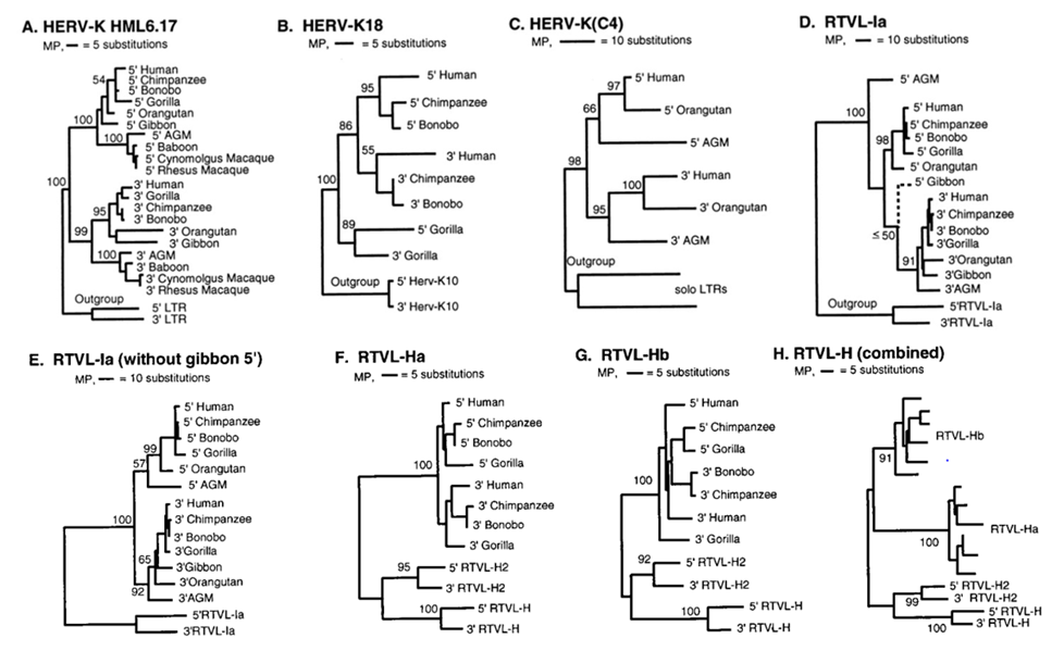 Несмотря на то что последовательность нуклеотидов в LTR может и изменяться в результате различных процессов, происходящих в геноме (вставки и утраты участков ДНК, кроссинговер и др.), LTR человекa, шимпанзе и «карликового шимпанзе» бонобо, как правило, оказывались наиболее сходными по составу; LTR-последовательности гориллы и орангутанга — несколько более далекими;а африканской зеленой обезьяны (AGM) и макаки,относящихся к низшим узконосым, — наиболее далекими, что соответствует данным палеонтологии (Рис. 8).