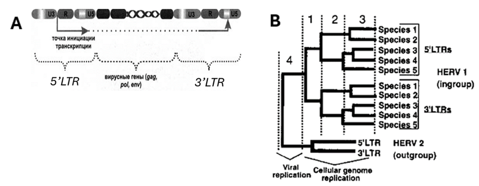 Рис. 4. Анализ мутаций в «длинных концевых повторах» (LTR) эндогенных ретровирусов как инструмент построения «эволюционного древа». А — пример строения «эндогенного ретровируса» с двумя «длинными концевыми последовательностями» 5’LTR и 3’LTR[21]. В — пример гипотетического эволюционного древа, восстановленного с помощью анализа генетического состава «длинных концевых повторов» (5’LTR и 3’LTR) двух гипотетических эндогенных ретровирусов (НERV-1 и НERV-2). Эволюционная история, о которой свидетельствует накопление мутаций в 5’LTR и 3’LTR, начинается после внедрения вируса в геном животного (фаза 1). Поскольку мутации происходят в каждом из «длинных концевых повторов» — 5’LTR и 3’LTR — независимо, можно выстраивать эволюционные деревья на основе данных по каждому из LTR, проверяя таким образом надежность реконструкции[22]