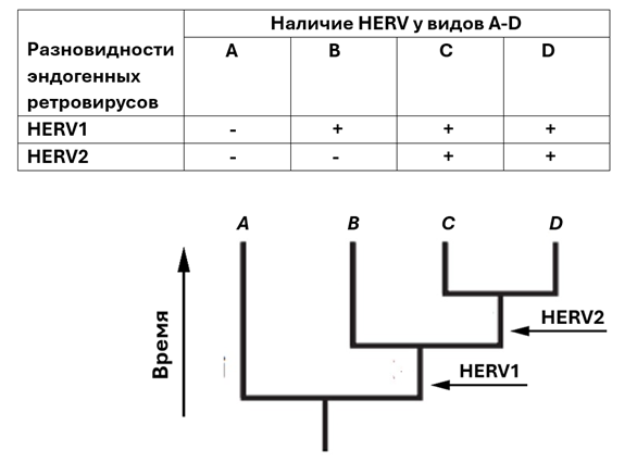 Анализируя количество общих для разных видов ретровирусных вставок у ныне живущих видов, можно, таким образом, понять, как выглядело их эволюционное древо. Ведь однажды встроенная в ДНК копия ретровируса никуда из этого места генома обычно не перемещается. Учитывая размер геномов позвоночных (>109 пар нуклеотидов) и относительно равномерный и случайный характер внедрений ретровирусов, вставка одинаковых последовательностей ERV в одном и том же месте крайне маловероятна[14]. Существует расчет, сравнивающий вероятности случайного внедрения ретровирусов в ДНК одного примата с вероятностью гипотезы, что они унаследованы этим приматом от общих предков[15]. При этом учитывается, в частности, недавно открытое явление, что вероятность внедрения ретровирусов в некоторые точки ДНК может быть несколько выше, чем в другие. По результатам расчетов, гипотеза случайного внедрения менее вероятна на 46 порядков величин (единица с 46-ю нулями). Надо отметить, что в расчетах везде в случае неопределенности принимались оценки величин, минимизирующих вероятность «гипотезы общего предка». Поэтому, если мы видим у двух видов идентичные ретровирусные последовательности ERV1 и ERV2, но не видим их у третьего, то первые два вида (A и B), скорее всего, ближе друг к другу (Рис. 3).