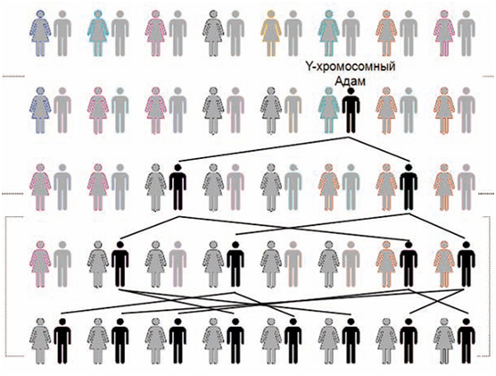 Y-хромосома — это хромосома, которая у человека есть только у мужчин. Так как Y‑хромосома передается только от отца к сыну, то все современные Y‑хромосомы происходят от данного мужчины, которого называют «Y‑хромосомным Адамом». Это наиболее близкий по времени общий предок всех ныне живущих людей по мужской линии. Но и до него, и в его время жили другие люди, гены Y-хромосомы которых не дошли до потомства (Рис. 9).