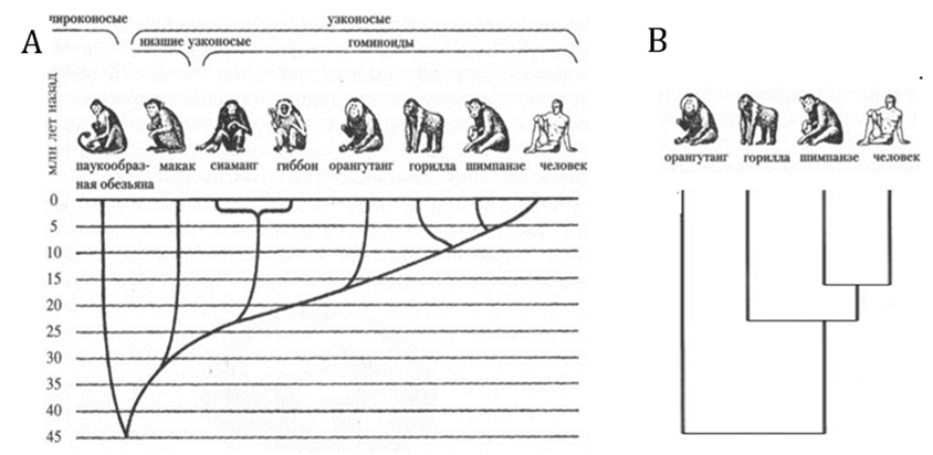 Рис. 6А. «Эволюционное дерево» высших приматов, построенное на основе: А