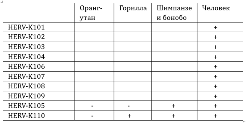 Надо отметить, что в работе Барбулеску также приведены данные о количестве различий в «длинных концевых повторах» (LTR) ретровирусов, позволяющие оценить их относительный возраст. Различия в LTR вирусов, свойственных только человеку, находились у семи разновидностей в пределах от нуля до шести, у одной — составляли 17. Два провируса, общих для человека и современных человекообразных обезьян (HERV-K105 и HERV-K110), имели наибольшее количество различий (36 и 38), что согласуется с представлениями об их значительном возрасте по положению на эволюционном древе.